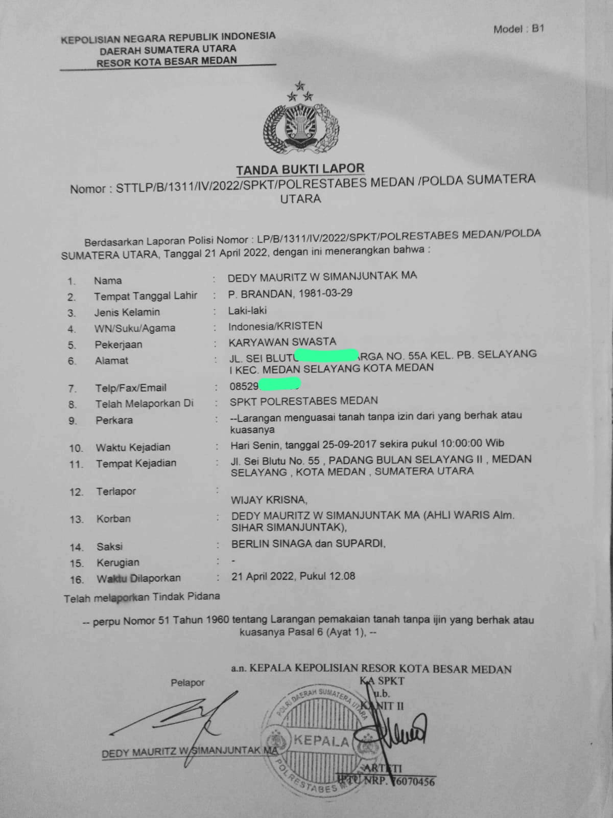 Sejak 2015 Dedy telah melaporkan penguasaan lahan tanpa hak yang terletak ditengah kota Medan (Jl.Sei Belutu Medan) ke Polda Sumut, menyampaikan LP Pertama atas nama Dedy M Simanjuntak MA, dengan Nomor: STTLP/1286/X/2015/SPKT 'I', POLDA SUMATERA UTARA. Namun oleh Polda dilimpahkan justru ke Polrestabes Medan.